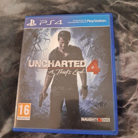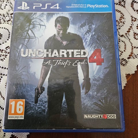 PlayStation 4 Uncharted 4: A Thief’s End -peli. Toimintaseikkailupeli PS4-konsolille. Ikäraja PEGI 16. Fyysinen levyversio sinisessä PS4-kotelossa.