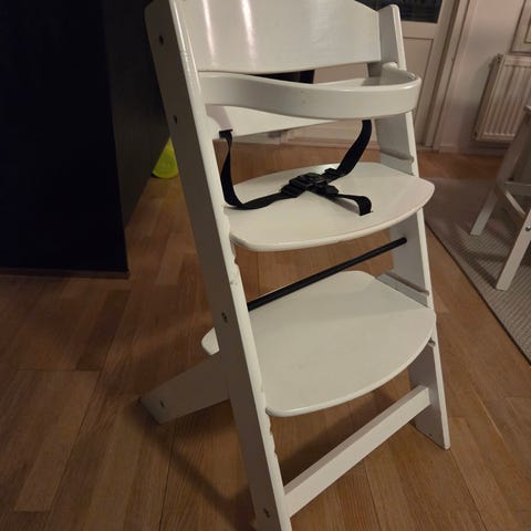 IKEA syöttötuoli. Valkoinen muovinen istuinosa ja selkänoja, harmaat metallijalat. Pöytä syötyötuoliin. Sopii pienille lapsille ruokailuun pöydän ääressä. Kuvassa mukana myös muita lastenhoitotarvikkeita, kuten potta, supistaja ja amme.