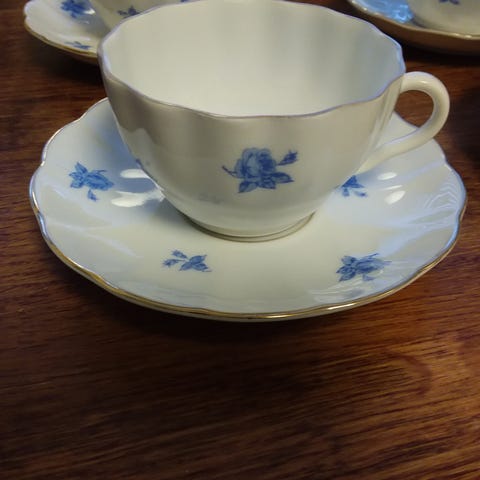 Greta-Lisa Jäderholm-Snellmanin Arabialle suunnittelema, v 1931-56, pikkuruusu sarja, malli OB, 3 tassia, 3 kahvikuppia ja 2 kakkulautasta, (toisessa kakkulautasessa pieni halkeama, katso kuva) Kunto hyvä/ kohtalainen, iän tuomaa kulumaa.