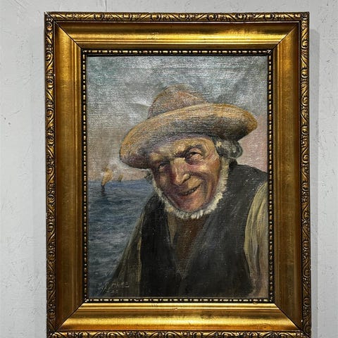 Öljyvärimaalaus kankaalle, signeeraus näkyvissä Ohme -22 (?). Kehystetty koristeellisella kehyksellä. Esittää merimaisemaa ja hymyilevää kalastajaa.