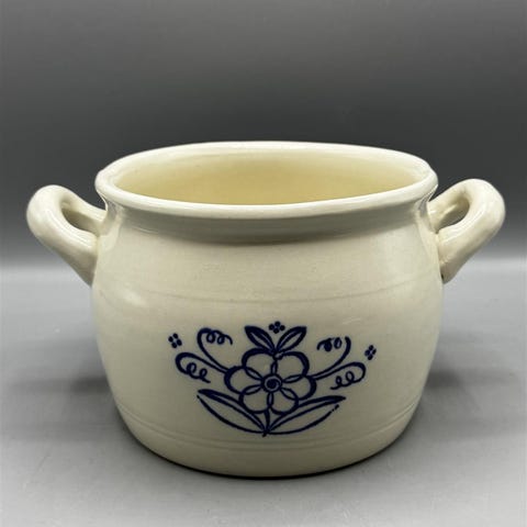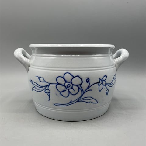 Arabia voipytty, jossa on sininen kukkakuvio. Piippuleima.