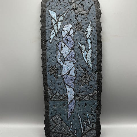Koristeellinen seinälaatta paperimassasta, jossa on sinisävyinen mosaiikkikuvio. Laatta on suorakaiteen muotoinen ja siinä on karkea pinta.