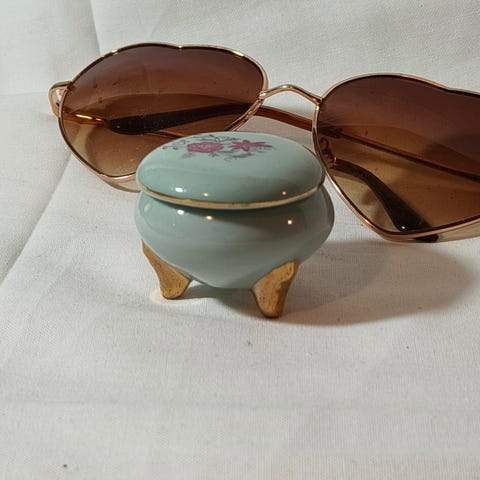 Posliininen munanmuotoinen korurasia, jossa sinivalkoinen kukkakuviointi ja kullatut yksityiskohdat. Rasiassa on saranoitu kansi ja se seisoo kolmella kullanvärisellä jalalla. Sopii pienten esineiden, kuten korujen tai muistoesineiden, säilytykseen sekä sisustusesineeksi.