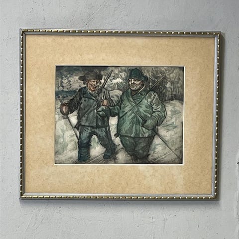 Taiteilija Oki Räisänen ”Juttutuokio” värietsaus.Signeeraus O Räisänen.Kehyksessä on pieniä kulumajälkiä, mutta muuten teos on hyvässä kunnossa.