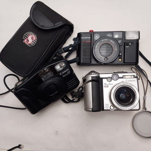 Kuusi digikameraa, 4 Canon ja 2 Olympus. Ei akkuja, joten kunto tuntematon. Myydään sellaisenaan, joten vaikka varaosiksi?