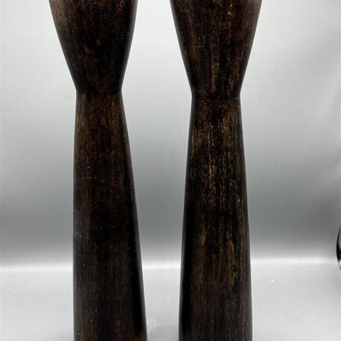Kaksi tummanruskeaa mangopuusta valmistettua massiivipuu kynttilänjalkaa, joissa on selkeä muotoilu. Valmistaja Marina Home Interiors on merkitty pohjassa. Kärjessä kynttilänpidike.