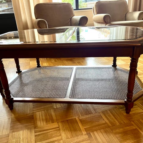 Lasinen pöytä koossa 120x70 ja korkeutta 36cm, lasi n.2cm paksua. Ostettu vajaa 10v sitten, ehkä Vepsäläiseltä.