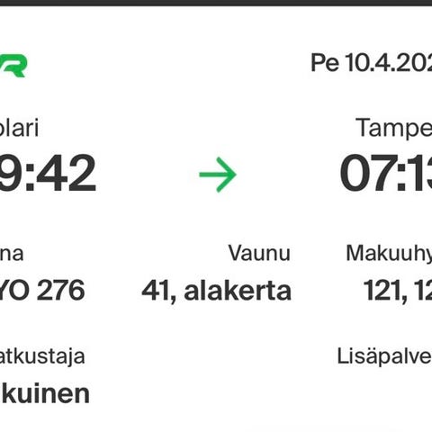 Yöjuna Tampere-Rovaniemi 27.3.2026. Koko makuuhytti, liput kahdelle ihmiselle ja kahdelle lemmikille.
