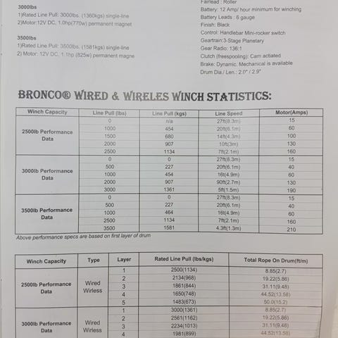 Jännite 12V Vetokyky: 2040kg / 4500LbsVaihteen välityssuhde 166 : 1 Moottorin teho 1,3hp Teräsvaijerin vahvuus / pituus: 5,5mm / 15,2m Käytetään min 12A akkua 3-vaiheinen planettapyörästö