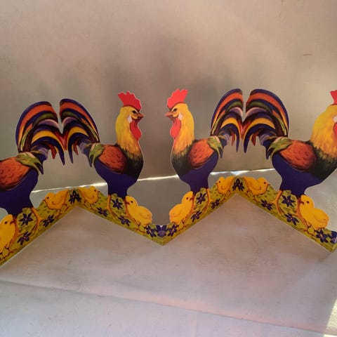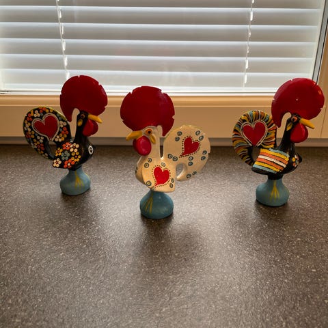 Keraaminen kukkokoriste. Kolme kukkoa narussa, käsityötä.