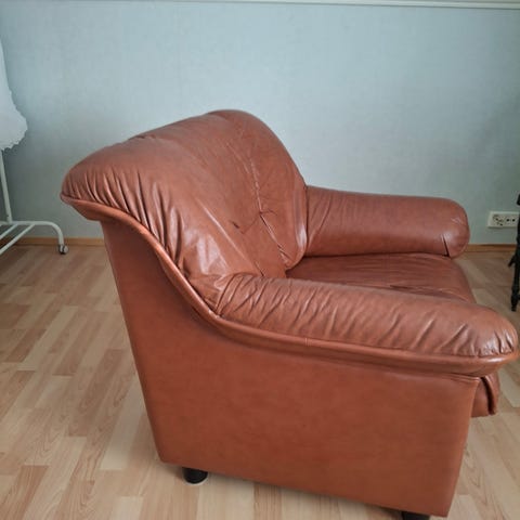 Kunto: Ikäisekseen erittäin hyvässä kunnossa. Nahka on säilynyt ryhdikkäänä ja puuosat ovat tukevat. Luonnollista vintage-patinaa, joka kuuluu tämän ikäisiin kalusteisiin.