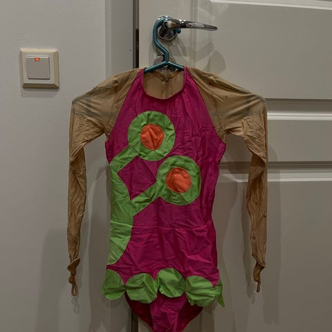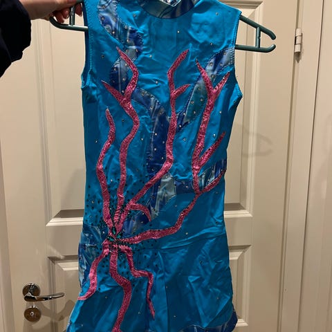 Lasten voimistelupuku. Muuten laadukas ja hyvässä kunnossa mutta perhoselta lähtenyt muutama strassi. Sopii varmaan noin 140-150 kokoiselle.