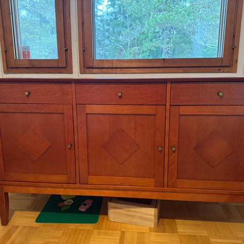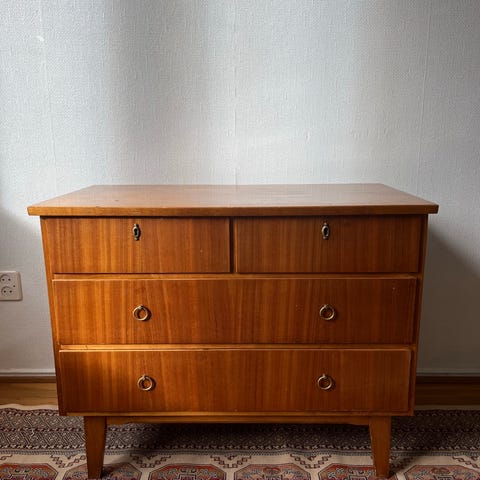 Hakusanat: vintage, lipasto, ruskea, kaareva, laatikot, vintage huonekalut, metallivetimet