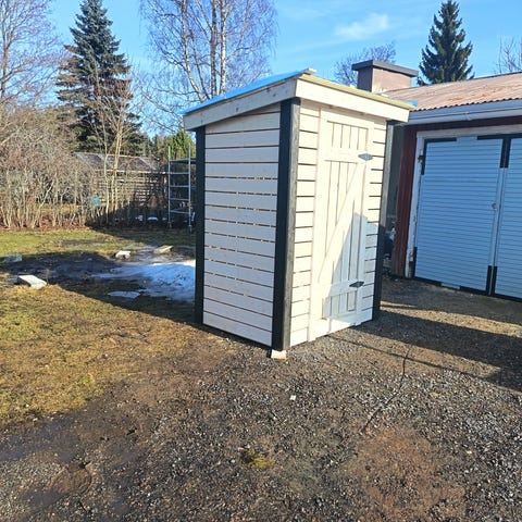 Käyttövalmis siirrettävä varasto koko 235x360cm liukuovi lev. 155cm, pohjamaalattu, aluskate+musta peltikatto, lautalattia.