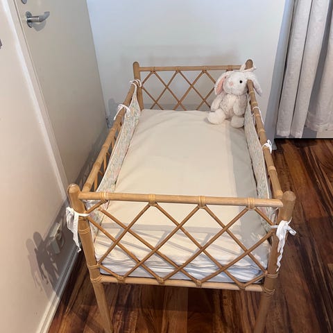 Rottinkinen ensi sänky. Vanha mutta toimiva. Yhdestä kohtaa korjattu mutta ei haittaa käyttöä. Mukaan saan kosteusvauojan, patja, petarin, alus lakanan, reunapehmusteen ja sen päälisen, verhon.