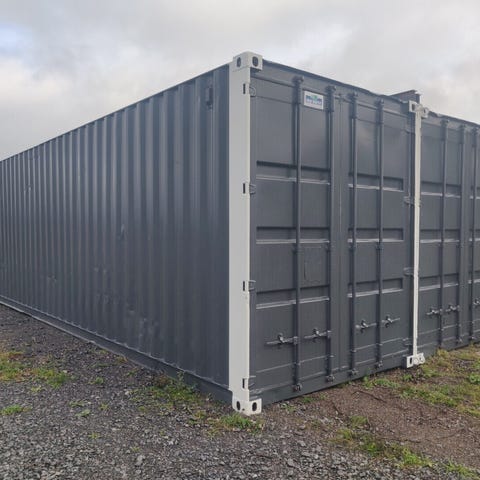 Kahdesta 9 metrisestä käytetystä kontista rakennettu ylimaalattu autotalli.