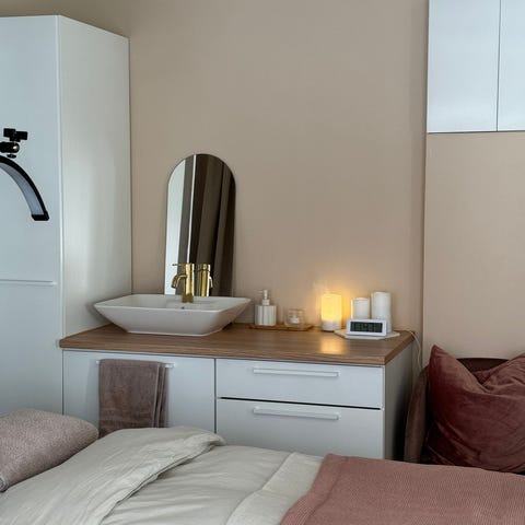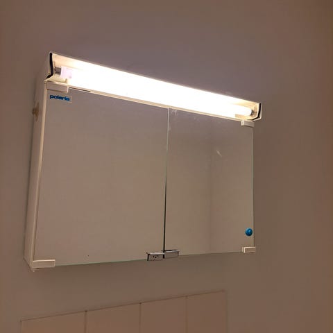 Peilikaappi, allaskaappi ja allas sekä hana ja pide. Wc pytty.