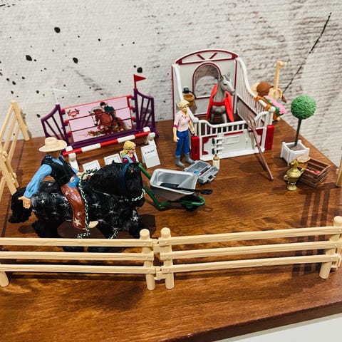 Tähän on laitettu paljon tavaroita ja hahmoja. Kaikki taitaa olla aitoja Sleissejä paitsi jämäkkä karsina on Playmobilin.