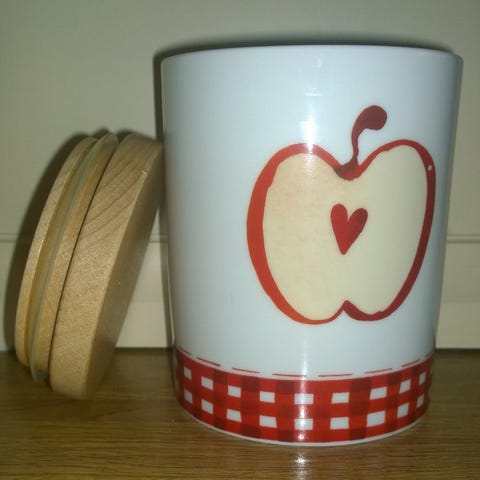 Arabia säilytyspurkit omenakuviolla. Valkoiset posliinipurkit, joissa punasävyinen omenakoriste ja punavalkoruudullinen reunus. Purkeissa on irrotettavat puukannet. Soveltuvat esimerkiksi keittiön kuivatuotteiden tai pienten tarvikkeiden säilytykseen.