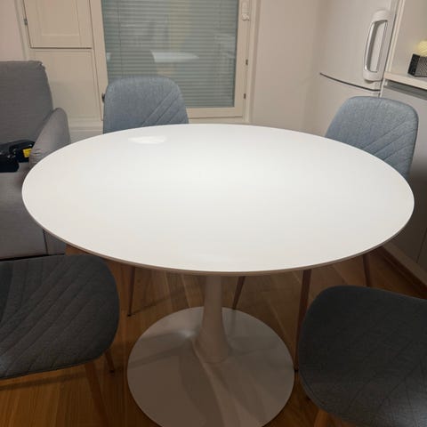 Pyöreä ruokapöytä, jossa on yksinkertainen yksi jalka. Pöydän väri on valkoinen, ja se sopii monenlaisiin tiloihin. Kevyt runko,’.