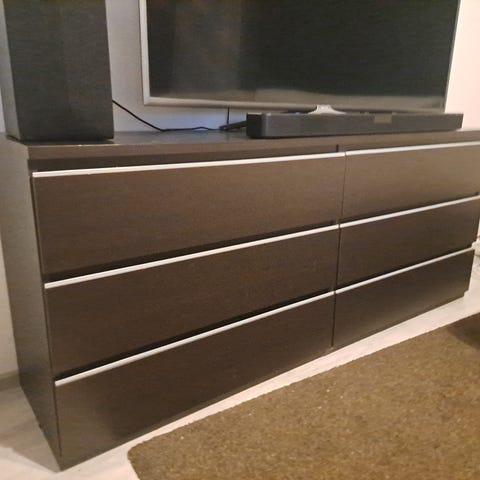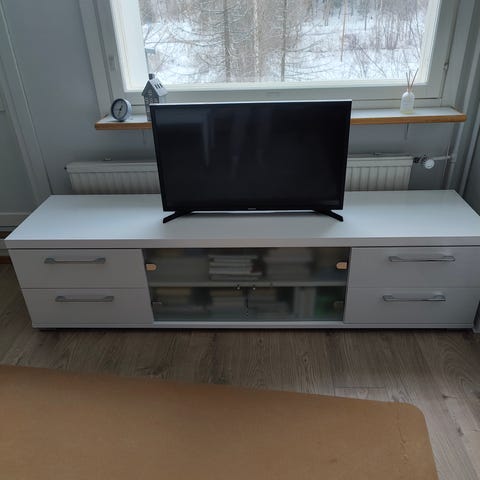 Myytävänä Ikean kiiltovalkoinen tv-taso.