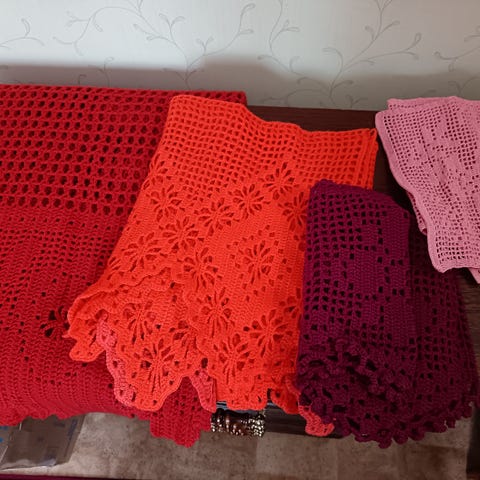 Virkattuja pitsikappoja keltaisia ja valkoisia alkaen 5 euroa. Värit kermanvaalea ja valkoinen ja keltainen, useita erilaisia pitsikuvioita ja reunapitsit. Koot vaihtelee, mutta kuvissa näkyy peiton asettelu sängyn ja lipaston päälle mittasuhteiden hahmottamiseksi. Ilmoitan tarkat mitat halutessasi. Hinnat 5 - 18 euroa. Voin lähettää. Mmm.