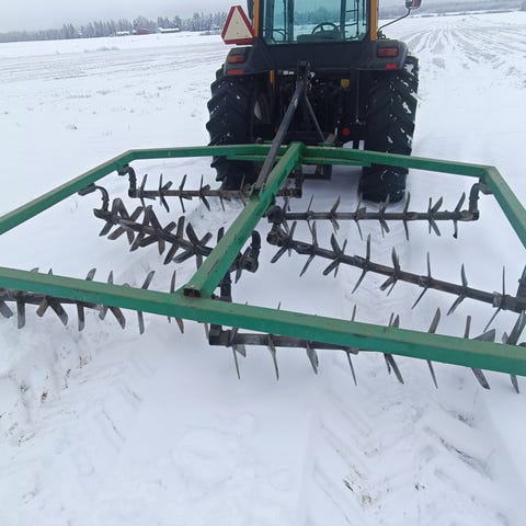 Hyväkuntoinen rullakarhi, lisävarusteena omavalmisteinen jälkiäes.