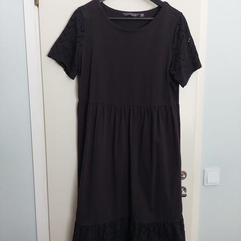 Väri musta. Materiaali 93 % puuvillaa ja 5 % elastaania. Mekossa on pitkät hihat ja kietaisutyylinen yläosa. Kietaisuosa löpsöttää vähän tuossa hengarilla mutta istuu mielestäni päällä ihan kivasti. Vartalonmyötäinen malli, helma levenee.