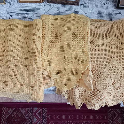 Virkattuja pitsikappoja punaisia ja oransseja alkaen 5 euroa. Useita erilaisia pitsikuvioita ja reunapitsit. Koot vaihtelee, mutta kuvissa näkyy peiton asettelu sängyn ja lipaston päälle mittasuhteiden hahmottamiseksi. Ilmoitan tarkat mitat halutessasi. Hinnat 5 - 17 euroa. Voin lähettää. Mmm.