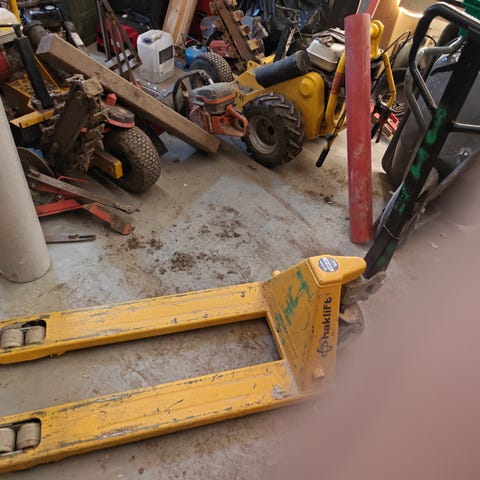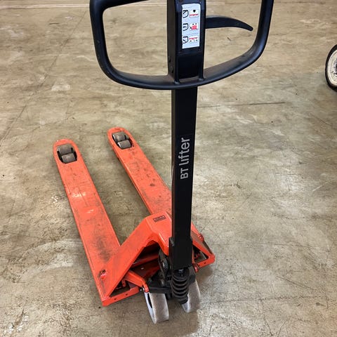 Käsikäyttöinen haarukkavaunu, kaksi kappaletta, punainen ja sininen. Soveltuu lavojen ja muiden raskaiden tavaroiden siirtämiseen varastoissa, työpajoissa ja muissa tiloissa. Molemmissa haarukkavaunuissa on käsikäyttöinen pumppumekanismi ja ohjausaisa. Haarukat on suunniteltu eurolavojen ja vastaavien kuormalavojen nostamiseen ja siirtämiseen tasaisilla alustoilla.