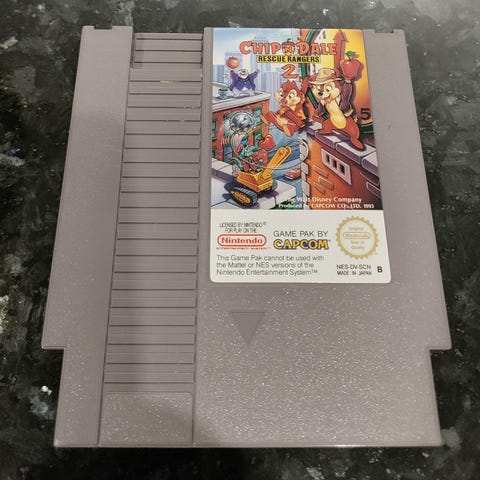 Nintendo Chip ’n Dale Rescue Rangers NES-peli. Alkuperäinen 8-bittinen pelikasetti Nintendo Entertainment System -konsolille. Pelin julkaisija Capcom. Mukana muovinen suojakotelo kasetille kuvien mukaisesti. Peli on skandi versio SCN