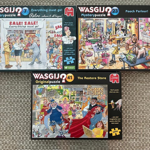 Wasgij Destiny, Original ja Mystery palapelejä. Kaikissa palat tallessa pussitettuna ja vihjelaput mukana (D19 ja O31 peleissä vihje on laatikon kyljessä).