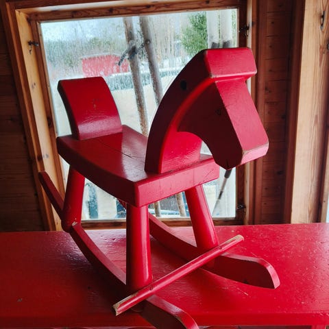Siro, vaalea ja puinen keinuhevonen. Keskiosan värjäymä jäänyt kukkaruukun pohjasta, ollut käytössä myös kauniina kukkatelineenä hetken. Vain nouto.