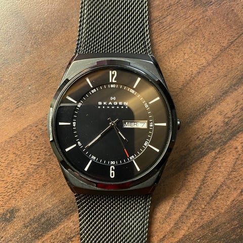 Miesten Skagen 858XLSLB rannekello, jossa teräsranneke. Muutama pieni naarmu kellolasissa mutta muuten siistissä kunnossa. Rannekkeen pituus kellotaulusta kellotauluun 19 cm ja kellotaulun kanssa 24 cm. Ostaja noutaa tai maksaa postikulut.