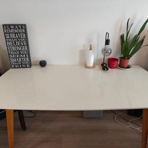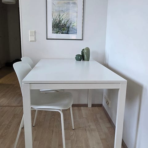 Myydään kuvanmukainen, paljon käytetty 6 hengen ruokapöytä. Ostettu aikoinaan Kodin Ykkösestä. Valkoiset jalat, joita ei ole irroiteltu ja tumma pöytälevy. Pöytälevyn koko 90cmx170cm, korkeus 74cm. Jämäkkä, tukeva, vakaa.