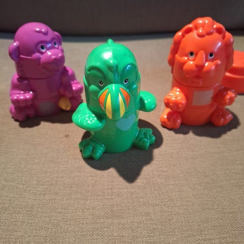 Hahmot kuluneet mutta värit kirkkaat ja lelut ehjät