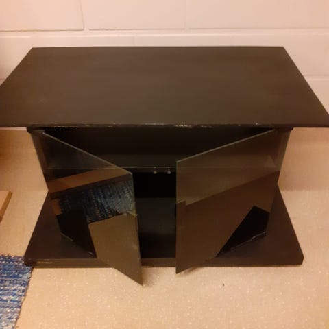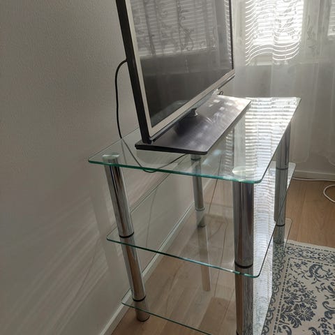 Hyvässä kunnossa oleva tv taso, jossa lasipinta ja vedettävä laatikko. Pieniä käytönjälkiä on, mutta eivät pistä silmään. Saa tarjota, myydään uuden tieltä pois.