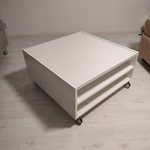 Valkoinen ovaalinmuotoinen sohvapöytä. Pöydässä on ylä- ja alataso, jotka tarjoavat laskutilaa esimerkiksi lehdille, kaukosäätimille ja muille arjen tavaroille. Tukeva pöytä, maalattu valkoiseksi. Sopii olohuoneen sohvapöydäksi tai pieneen tilaan apupöydäksi. Vain nouto. Nouto viimeistään 15.3.2026