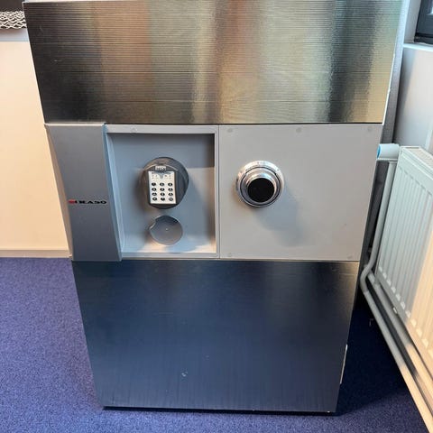 Kaso E-sarjan kassakaappi. Vaalea, lattiatasolle sijoitettava kaappi asiakirjojen ja arvoesineiden säilytykseen. Kaapissa on metallirunko ja ovi mekaanisella lukolla. Sisäpuolella on säätökiskot mahdollisia hyllyjä varten.