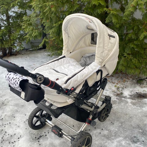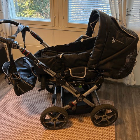 Myyntiin käytetyt mutta edelleen oikein siistit yhdistelmävaunut. Vaunukoppa sisältyy, sekin siisti. Kuomun sisäpuolella kankaassa pieni jälki. Aisaa saa nostettua ja laskettua sekä myös kokonaan siirrettyä toiselle puolelle, jotta vaunuja voi ohjata kummalta puolelta haluaa. Isot umpikumirenkaat, puhkeamattomat eikä tarvitse pumppailla. Nämä olleet oikein näppärät myös talvella isojen renkaiden ansiosta. Alhaalla kori, johon saa tavaraa mukaan. Mukaan saa sadesuojan, hyttysverkon sekä verkkokassin.
