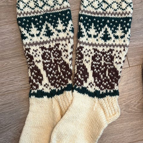 Nalle-langasta neulotut polvisukat, koko 39-40. Varsi kantapäästä 36 cm, terä 25,5 cm.
