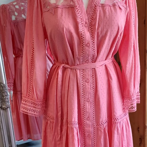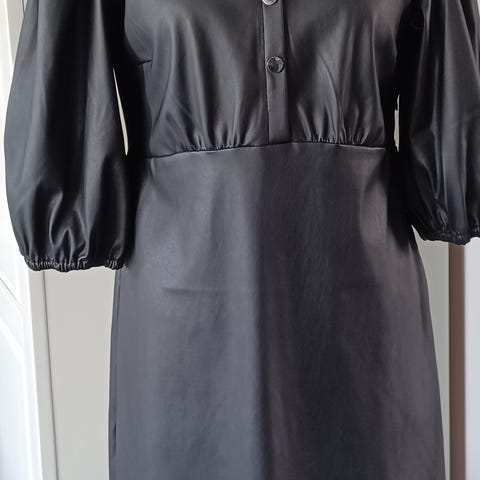 Ihana materiaali,viskoosi jossa satiinimainen pinta. Rinnanympärys 105cm, vyötärö n.90cm, pituus 118cm. Kuvassa nahkavyö ,ovh.45€ ,hinta nyt 7€.Mekon ovh. 129,90 €. Hinta nyt 30€.Toimitus postissa maksaa 7€.