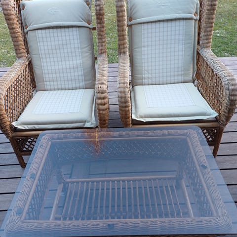 Varattu! Parvekkeelle koko setti: rottinkituolit, pöytä, viltit ja pehmusteet