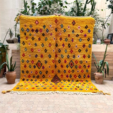 Tässä säväyttävässä käsinsolmitussa Metsäksi nimetyssä design-matossamme on elävän sävyinen oransi pohja ja värikkäät symboliset yksityiskohdat. Käsisolmittu lampaanvillamatto, joka taatusti tuo sielun huoneeseen. Berberien taideteos Marokosta, solmittu Khemissetin alueella Atlas-vuoristossa. Matto on pesty solmimisen jälkeen. Niin pehmeä, että tällä voi nukkua vaikka päikkärit! Koko noin 205x165cm+ tuuheat hapsut perinteen mukaan toisessa päässä, eli siellä minne matto päätetään.