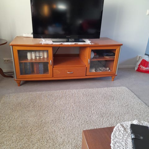 Valkea puinen tukeva tv-taso. Taso on painava, koivua. Laatikko liukuu hyvin ja täysin ehjä, lasikaapit.