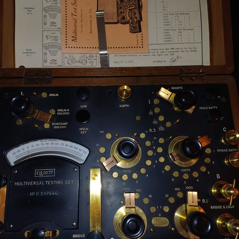 Hartmann & Braun puinen mittalaite puulaatikossa. Laite on varustettu metallisilla nimikylteillä ja kannen kahvalla. Sisällä on kytkimiä, säätönuppeja ja kela, jotka on kiinnitetty metalliseen paneeliin. Sopii esimerkiksi teknisenä esineenä, keräilykohteena tai sisustuksessa koristekäyttöön. Tarkempi käyttötarkoitus ja toimintakunto eivät käy ilmi kuvista.