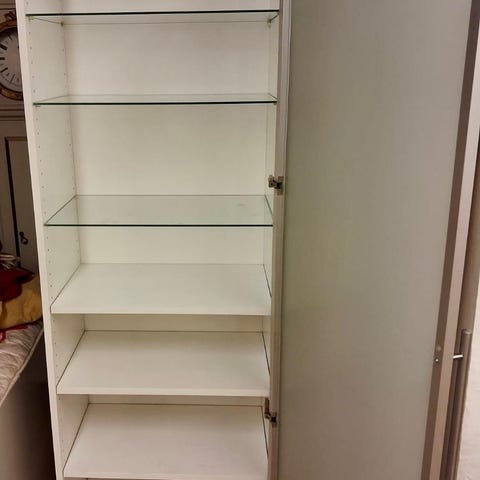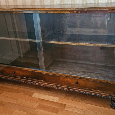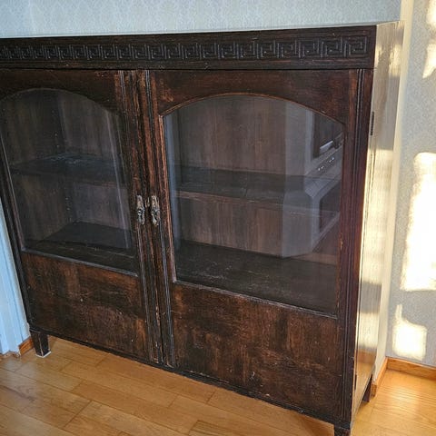 Vanha ”piiankaappi”: lasiovet, koristellut yläkulmien leikkaukset, hyllyt astioille