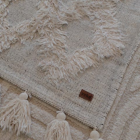 Kauniisti kuvioitu, valkoinen Dyyni puuvillamatto. Maton kuviointi on kohokuvioista hapsua, reunaa koristavat kauniisti solmitut tasselit. Matto on ohut ja kevyt, joten se on helppohoitoinen ja kepeä valinta. Maton alle voi lisätä liukuestepohjan, jotta se pysyy paremmin paikoillaan.