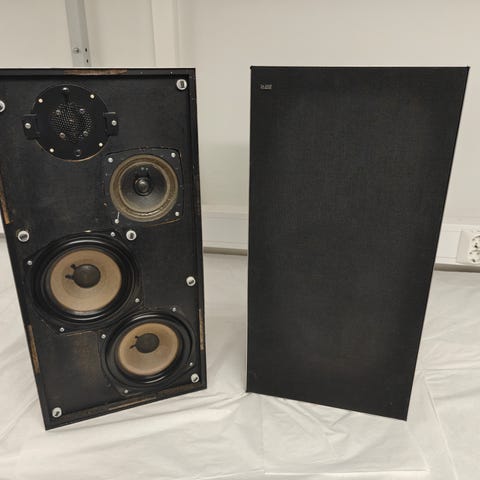 Vintage B&O Beovox 2600 kaiuttimet 70-luvun alkupuolelta. Teknisesti kunnossa mutta kotelot maalattu jälkikäteen vaalean ruskealla maalilla. Kiinteät kaapelit ilman Din-liittimiä, toinen pitkä ja toinen lyhynnetty. Ehjät eturitilät joissa kullanväriset B&O-logot. Koko (k x s x l) 61 x 28 x 24cm. Paino n. 10 kg/kpl. Nouto Pirkkalasta tai Tampereelta.