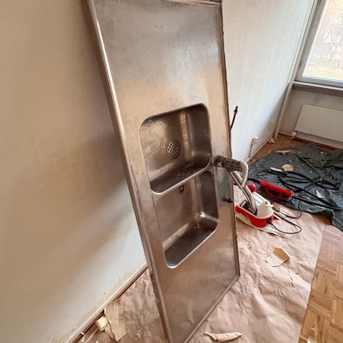 Tiskiallas, pölyinen, ehjä, hyvä kunto. Jos teet kesäkeittiön tai muuten vaan tarvitse kotiin uuden tiskipöydän. Mitat kuvissa. Toivotaan pikainen nouto! Sijainti Vaasankatu, Kallio. Hinta vain 20€.